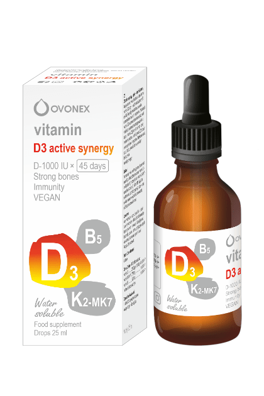 Vitamín D3 active synergy kvapky • Podporuje: Imunitu • Zuby • Kosti • Svaly • Doplnok stravy obsahujúci vodou riediteľnú aktívnu formu vitamínu D3, ktorý v súčinnosti s vitamínmi B5 a K2-MK7 reguluje metabolizmus vápnika a napomáha jeho využitiu v organizme.