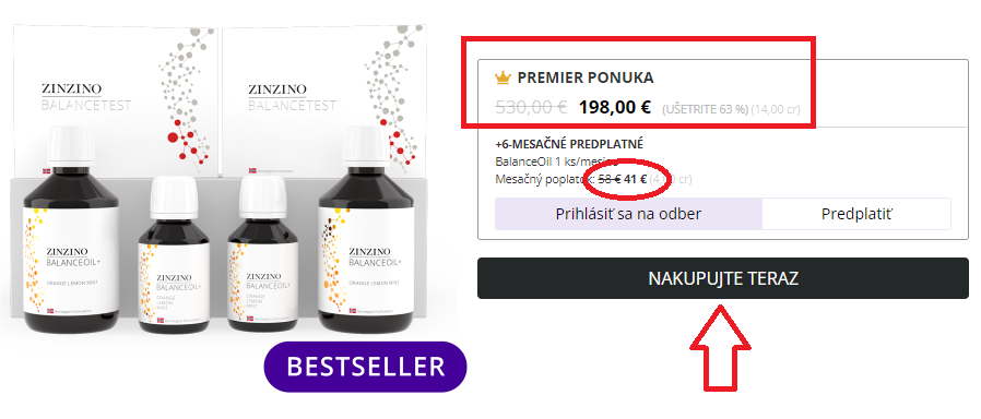 Keďže produkty Zinzino možno klasifikovať ako potravinové doplnky, ktoré si telo nevie samo vyrobiť a potrebuje ich pre dosiahnutie optimálneho stavu zdravia každý deň prijímať, odporúčame zvoliť nákup za Prémiové ceny a doplnky užívať minimálne 4-6 mesiacov a počas tohto obdobia si svoj zdravotný stav overiť TESTOM. Viac sa dozviete nižšie: