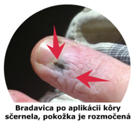 ◘ Po prvom priložení kôry môže bradavica sčernieť, stmavnúť, (ale aj nemusí). Bradavica môže byť čierna hneď ráno po zložení kôry, alebo môže sčernieť v priebehu dňa. Povrch bradavice po stmavnutí môže pripomínať chrastu. Ak sa tak stane, už ďalšiu kôru večer neprikladajte! Bradavicu nechajte nasledujúce dni nezalepenú, voľne na vzduchu a počkajte kedy sama odpadne.