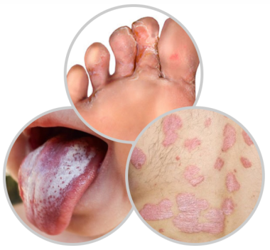 Neriešený problém s vnútornými plesňami môže prerásť do problému s plesňami na pokožke • Kožné problémy a ekzémy • Svrbivé, či červené šupinaté miesta pravidelného alebo nepravidelného tvaru na pokožke tela • Svrbenie a olupovanie pokožky medzi prstami na nohách a na iných miestach na pokožke • Plesne na nechtoch • žltnutie a štiepeniu nechtov • Pľuzgiere, alebo trhliny väčšinou v záhyboch na pokožke tela