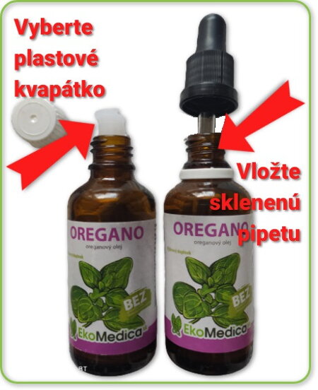 Návod na použitie: Oreganový olej otvorte, vyberte originál plastové kvapátko na oreganovom oleji, vložte pipetu do fľašky a zašróbujte.